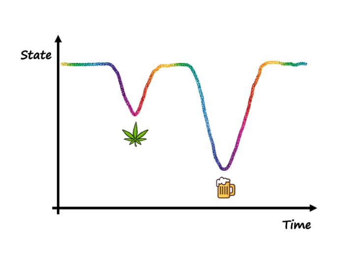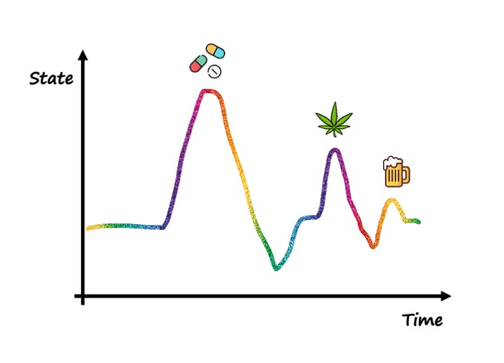 After around 2 years of abstinence I felt like I had learned how to express myself in social settings and managed to lose my dependency on alcohol. I didn’t feel drawn to drugs anymore and thought I stood above them now. So I decided that I could stop being an outcast weirdo, relax my straight-edge policy and allow myself to have a few drinks every now and then when it was conducive to the social situation. This is when the final step of my journey towards complete teetotalism occurred: I realized repeatedly that alcohol could not get me pleasantly high anymore! I would drink and get a bit more loose-mouthed but basically I didn’t feel much different under the influence from how I felt sober. To me, this was proof that I had really managed to lift my baseline up and build actual confidence. Now that I was already confident in my everyday life, alcohol didn’t add more confidence. It just made me a bit more careless and crude. So instead of getting me high, it actually pulled me down a bit!3 This was a massive realization and I think it translates to other drugs too: Drugs don’t necessarily get you high. They just get you to a certain level. If your baseline is already above that, they can actually bring you back down! And when you are on a sustainable baseline growth path those drug-induced sudden state spikes throw you off balance, disturb your routines and leave you confused. After understanding this, it was a no-brainer for me to stop using drugs forever. The only real benefit had vanished. It just wasn’t worth the time, energy and money anymore.